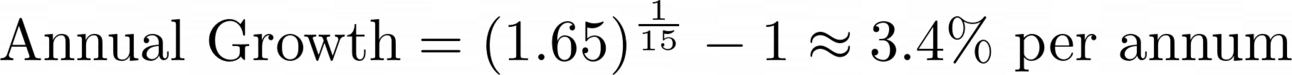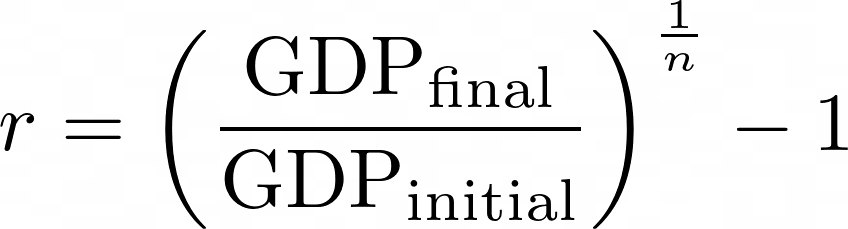 from 2000-2005 for n=25 yrs, we get a nominal growth rate r ~ 10%. Adjusting for a ballpark estimate of an average annual inflation around 6% in Fischer’s formula, we get a real annual avg. growth rate of ~5%.