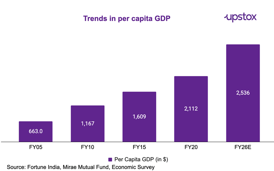 But as per a recent article by Upstox, India’s per capita GDP has been linearly climbing over the last 20 years and has crossed a critical threshold which drives the virtuous cycle of discretionary spending leading to greater per capita GDP. Moreover since 2015 it’s showing over 8% per cent CAGR, reflecting an exponential trend.