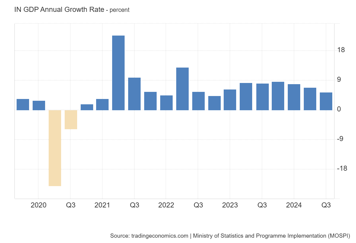 We live at a growth phase and an emerging economy like India wouldn’t like to miss the zeitgeist. With Q3 FY25 growth at 5.4% as depicted below, we clearly seem to be in a bust cycle. This is coupled with recent rupee depreciation driven by foreign investment outflow.