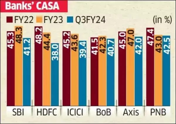 market share of companies and only a small portion of it is the actual investment by investors. Hence in India, bank deposits are still the default choice for most people to store their money due to safety, liquidity, and familiarity, with the total current bank deposits in India amounting to nearly ₹ 220 lakh crore with a 10% CAGR. Over 60% of it comes from cheap household deposits (cf. just 25% ie. ₹ 100 lakh crore in case of capital market). And nearly 50% of these household deposits are from non-term CASA deposits and remaining from FDs, etc. And these CASA funds are really cheap money for banks (much below the large repo rates) : for instance, in FY24, savings deposits earned between 2.7% and 3%, while term deposits (1-3 yrs) offered rates ranging from 6% to 7%. Moreover these retail CASA deposits are more stable for banks than wholesale deposits. But people are becoming smarter now and want investments which can beat inflation. So they’re shifting from CASA towards Mutual Funds (MFs). And though these MFs re-invest a part of their folio into banks’ CDs, they do so at higher rates than CASA. So its costly for banks. Consequently this CASA average for Indian banks has dropped to 40% now, from around 50% some years back, indicating that people are doing wholesale/bulk/term deposits. (See below graph).