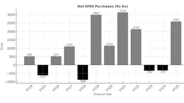 So RBI stepped in Feb 2025 for some STLM. It sold over ₹ 1 lakh crore in lieu of G-secs through OMOs (contrast with the tight money policy in the last 2.5 inflation-ridden years- ref. graph below), sold ₹ 50,000 crore through 56-day VRR auctions, and sold around over ₹ 1 lakh crore through rupee/dollar forex swap auctions. By the end of March 2025, the ₹ 3 lakh crore liquidity deficit became a ₹ 90,000 crore surplus. But remember this STLM is a symptomatic, not systemic relief.