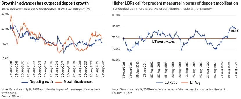 The lending scenario for banks is also gradually deteriorating. While the deposits crunch has reduced the deposit growth to c.11%, the lending growth is c.15%. This has pushed the Loan-to-Deposit Ratio (LDR) to an all-time high of c.80% (Graph below)