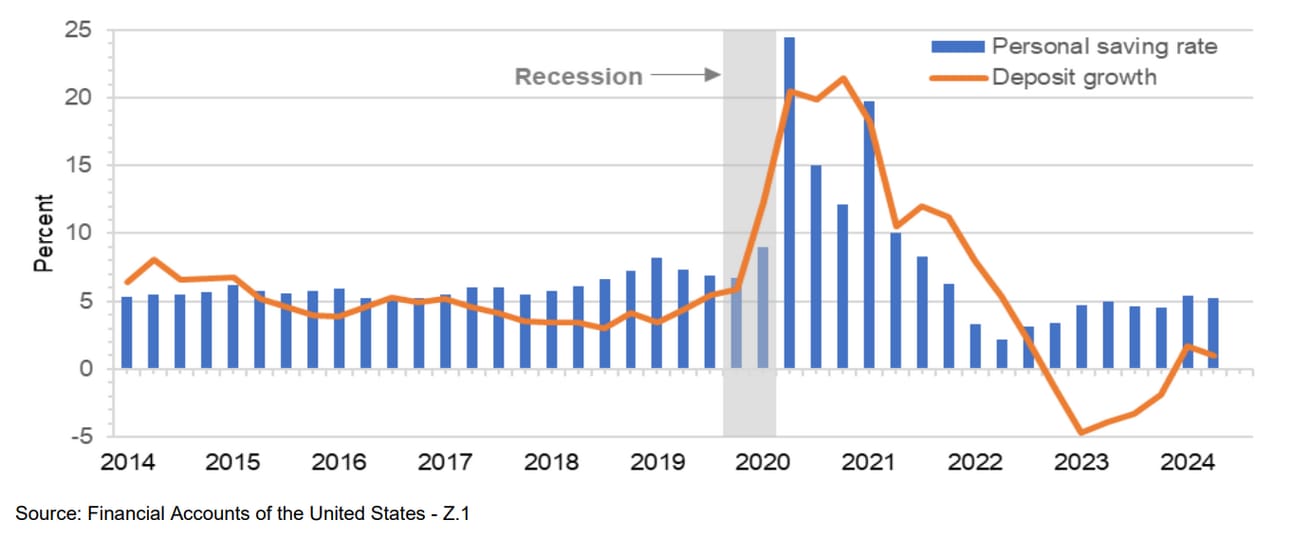 In the US, deposit growth has been declining since FY22 and has gone below savings rate (See below graph). This means people have started investing their household savings in market instruments like MMMFs instead of depositing in banks in order to get returns close to market rates. These MMMFs further invest into Fed’s ON-RRP (Reverse Repo) facility for liquidity management, effectively bypassing banks and hampering their deposits.
